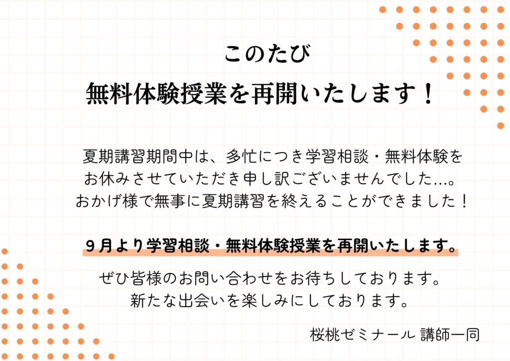 夏休み期間は混雑の為、休止しておりました『学習体験』・『無料体験』の受付を再開させていただきます。ぜひ桜桃ゼミナールの授業をお気軽にお試し下さい。 お申込みは公…