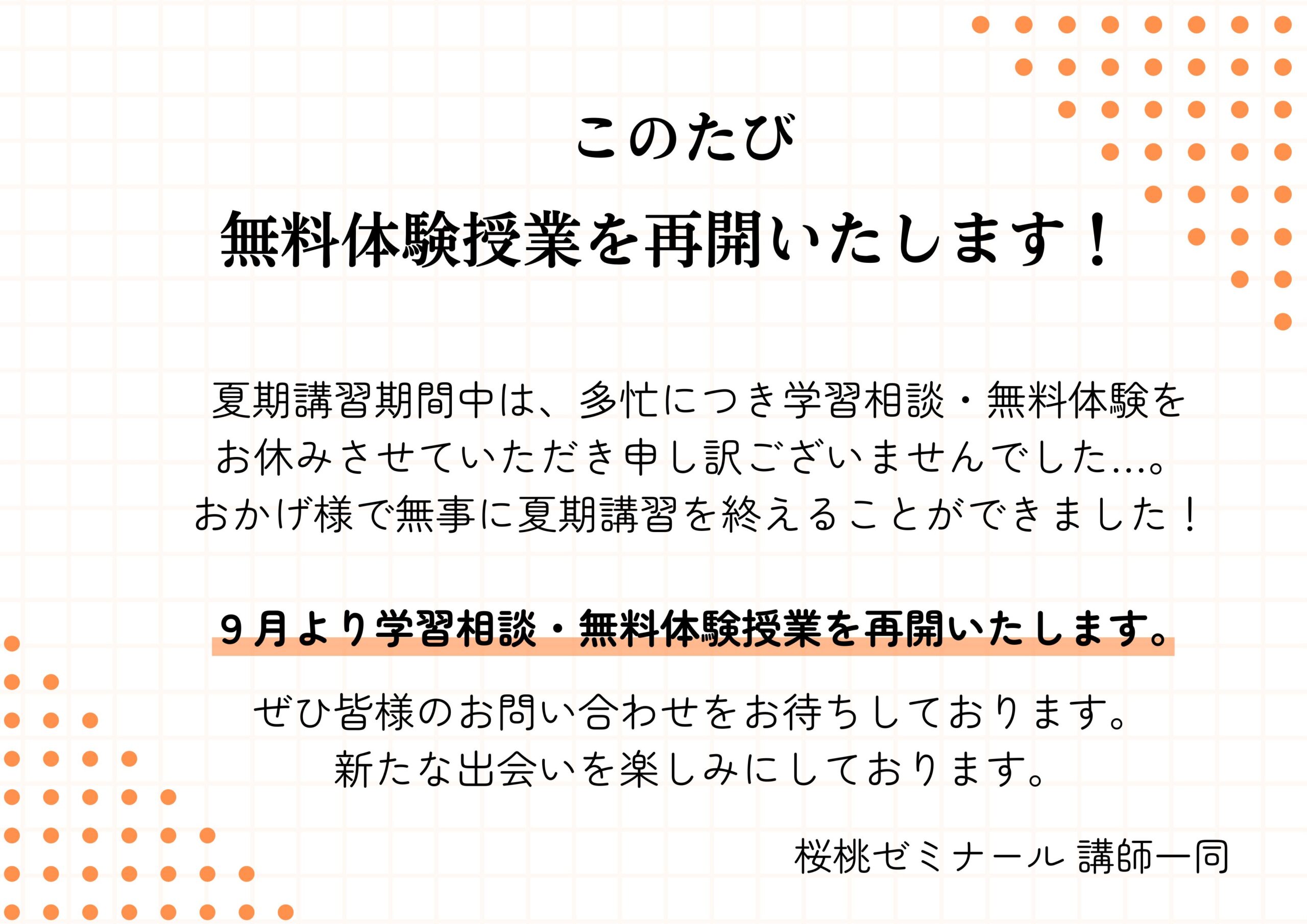 夏休み期間は混雑の為、休止しておりました『学習体験』・『無料体験』の受付を再開させていただきます。
